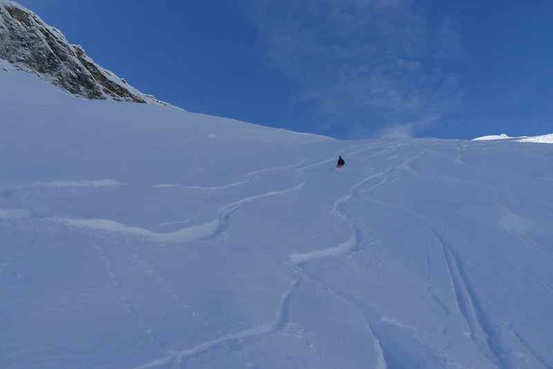Hier noch der zweite Teil unserer Freerideerlebnisse am Monterosa. Auch im März haben wir wieder großes Glück gehabt. Am ersten Tag haben wir wieder die Verhältnisse geklärt und haben uns warmgefahren. Mehr Piste, die Schneeoberfläche im Gelände war eher hart gefroren und kein Genuss. Der zweite Tag führte zu einem echten Höhepunkt, den ich schon vielleicht drei Jahre nicht mehr fahren konnte, weil die Verhältnisse es nicht gestattet hatten, als ich dort war. Und der nie großflächig verspurt ist und stets guten Schnee hat: Valle Perduta. Etwas die Felle bemühen und hoch zum Einstieg auf ca. 3.500 m. Von dort kann man dann bis Staffal abfahren, in schlechten Jahren Ende März etwas krautig, dieses Jahr einwandfrei bis runter. Dateianhang: