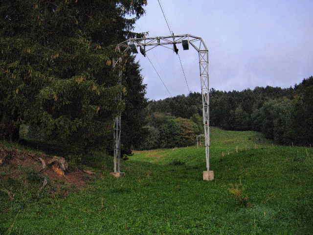Hier geht schon seit Jahren nichts mehr. Die Teller abmotiert, die Scheiben an der Talstation eingeschlagen rotet dieses Kunstwerk vor sich hin. rechts oben auf dem Grad war die Bergstation des Korbliftes.