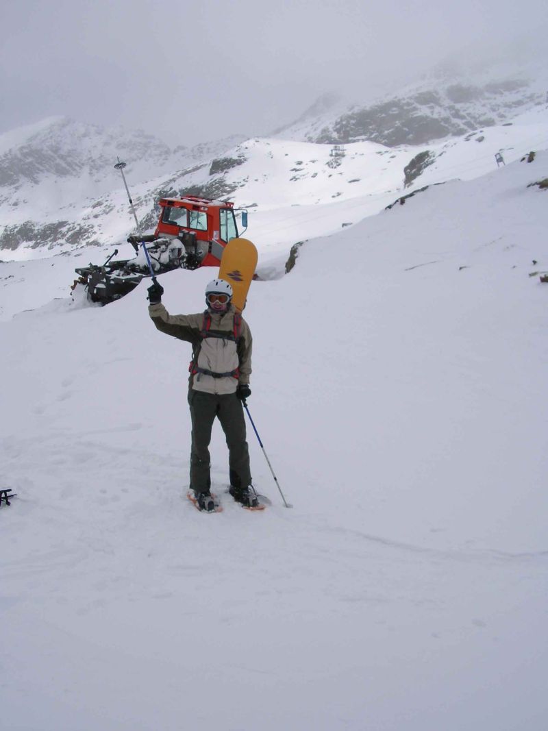 Die vor zwei Tagen gelegte Spur ist durch Schneefall und- verwehungen nicht mehr vorhanden, so dass wir erneut im Tiefschnee aufsteigen. Besonders anstrengend ist so ein Aufstieg für Snowboarder, da man mit den Schneeschuhen doch immer sehr tief in den Schnee einsinkt und somit sehr viel Kraft aufwenden muss. Endlich nähern wir uns der Gipfelstation, doch oben auf dem Gipfelgrat empfängt uns ein eisiger Wind. Wir müssen die ersten sein, die seit langen hier oben angekommen sind, keinerlei Spuren auch in windgeschützten Bereichen. Eine Pistenraupe steht funktionsuntüchtig nahe der Bergstation und die umgefallenen Liftmasten der ehemaligen Gletscherschlepplifte bieten einen bizarren Eindruck und verweisen auf bessere Zeiten, die weit zrück liegen müssen.