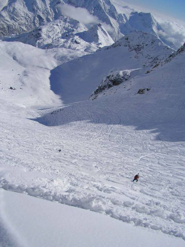 Alagna hat sich durch den Wegfall der wichtigsten Liftanlagen für Freerider weit davon entfernt das Freeride-Paradies zu sein. Die Einschnitte, die mit dieser Beschränkung verbunden sind, wirken schwer und reduzieren die Möglichkeiten Varianten zu fahren gewaltig. Für Tourengeher sind die Möglichkeiten natürlich noch immer vorhanden, doch man startet weitaus tiefer (ca. 2.700 HM) und ist somit deutlich eingeschränkter. Da mittlerweile (fast) alle Liftanlagen von der Aosta-Seite stammen, muss man sich wohl damit abfinden, das es ?das Alagna? nicht mehr gibt ? auch wenn es schwer fällt, denn eine Fahrt im Korblift klingt doch sehr verlockend. Mit der Punta-Inden-Gondel verliert Alagna sein Herzstück. Von dem her kann man eigentlich nur darauf hoffen, dass die Gondel zur Cresta Rossa gebaut wird und zwar eher als Freeride-Variante und nicht als Massenautobahn ? klingt zwar eher unwahrscheinlich aber ein bisschen Hoffen muss man doch.[/img]