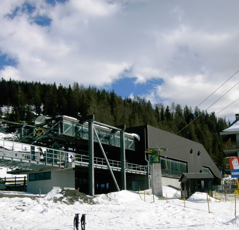 Dateikommentar: Bergstation der Agudio 6 EUB in Pila, davor Bergstation des Leitner TSL Baby Pila