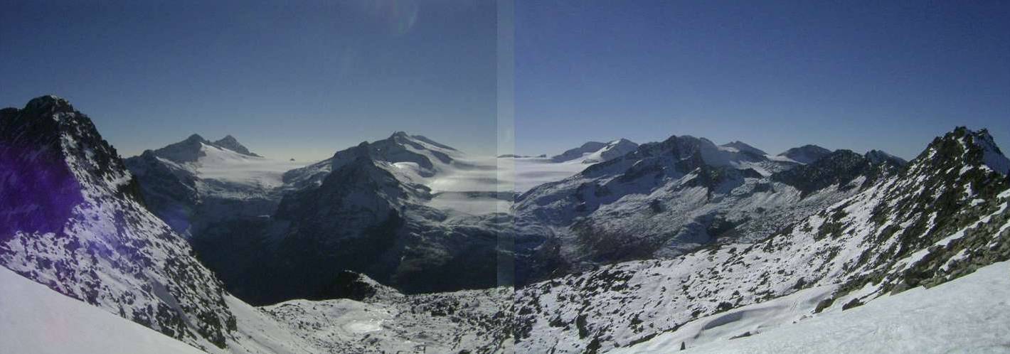 Dateikommentar: Blick von der Bergstation der SL nach links zur Cima Presena. Ein lohnender Abstecher... zumindest bis ins Joch - auch Forcella Sciatori genannt, weil man auf der anderen Seite Skitouren zum Adamello machen kann.