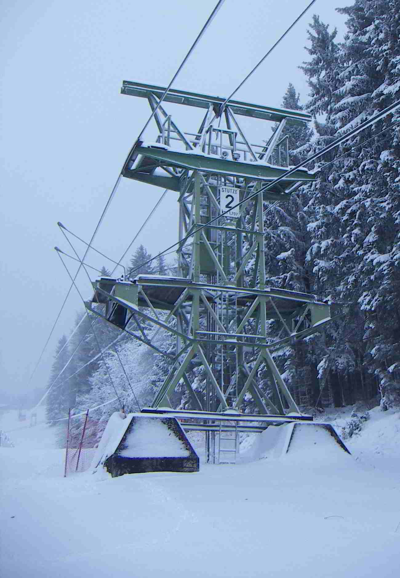 am ende dieses waldweges kommt man wieder auf die piste im oberen drittel und sieht erstmals die seile der gondelbahn und die stütze 2