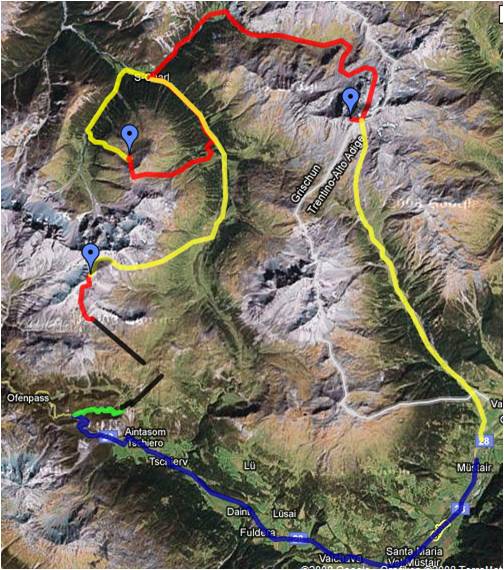 Der Piz Sesvenna ist mit seinen 3204 Meter der höchste Berg im Gebiet. Dieser Berg bietet alpintechnisch, schifahrerisch wie auch konditioniell einige Leckerbissen. Von S-Charl gehts direkt ins Val Sesvenna. Auf den ersten sechs Kilometer horizontaldistanz legt man nur gerade 600 Höhenmeter zurück. Für die gesamten 1400 Höehnmeter benötigt man rund fünf Stunden, davon die letzte halbe Stunde zu Fuss am Gipfelgrat. Auf dem Gipfel hat man eine Wunderbare Rundsicht richtung Südtirol (Vinschgau), Ortler, Stilfserjoch, Bernina usw. Nach einer kurzen Rast auf dem Gipfel hiess es aufbrechen, da wir noch 2000 Höhnemeter nach Müstair vor uns hatten.