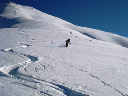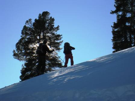 Am zweiten Tag haben wir uns für den Gipfel des 2797 Meter hohen Mot dal Gajer entschieden. Der Aufstieg liegt östlich ausgerichtet. Dies für uns umso wichtiger, da Tempereatur bis minus 20°C in diesem Tal keine Seltenheit sind. Ganz so kalt wurde es dann aber doch nicht (nur -15°C), aber die Bise blies ganz leicht und somit verwandelte sich das schattige Tal in eine Eiskammer. Nach einer Stunde erreichten wir aber die ersten Sonnenstrahlen, die wir gleich in uns aufsogen. Nach gut 3 Stunden erreichten wir den Gipfel und zu unserem Erstaunen waren wir an diesem Tag auch die einzigen. Im nachhinein auch gar nicht erstaunlich, da das einzige Hotel im Val S-Charl nur 36 Betten hat und davon mindestens die Hälfte Schneeschuhtouristen und andere Touristen sind. Auf dem windstillen Gipfel rasteten wir ausgiebig, betrachteten die umliegenden Gipfel und planten unsere Abfahrtsroute. Die Route ins Val Travü schien uns vielversprächende Hänge mit guten Schnee zu präsentieren und so war unsere Entscheidung schnell klar.