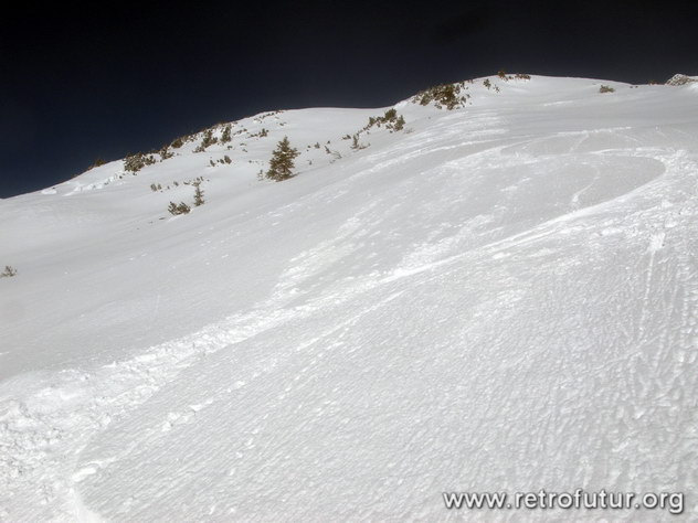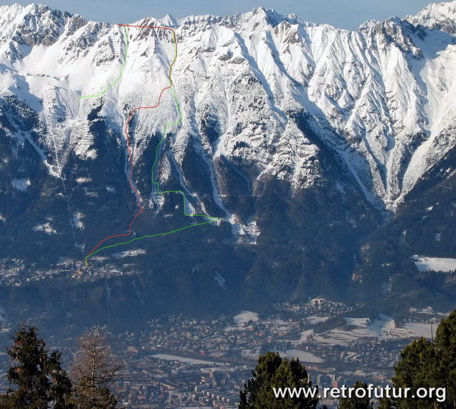 NB: Diese im oberen teil genialen Abfahrten bis runter zur Hungerburg lohnen wirklich nicht, man muss sich etwa 40 minuten durch echt fieses gestrüpp in einer lawinenrinne durchnudeln...zudem sollte eben keine lawine hinter einem herfahren wollen...