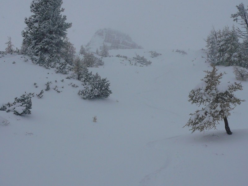Dateikommentar: Und auf in die ersten Hänge. Die anderen Tourengeher waren alle auf der Piste geblieben und so waren die Hänge rechts der Gondel jungfräulich - bei 50 bis 75 cm Pulver. Ein Genuss. Bodenkontakt gab es sehr selten. Nur bei Steilstufen im Gelände rutschte der pulvrige Schnee leicht ab und die Schneedecke war zwangsläufig nicht mehr so hoch. Aber mit meinen alten Ski kein Problem. Noch...