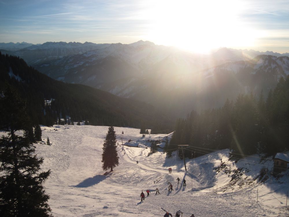 Bin gerade in oberbayerischen Landen. Meist nutze ich hier die 2h-Karten in aller Hergottsfrüh, bevor halb München anreist. Fast alle Gebiete in der Nähe (Ausdehnung ca. von Lenggries bis Aschau) werden erst ab 10:00 oder später überfüllt, während man den Liftbetrieb oft schon um 8:15 Uhr startet. Da ist man zum Familienfrühstück schon wieder am Tisch Heute habe ich es jedoch einmal genau umgekehrt gemacht. Einige Gebiete (Sudelfeld, Spitzing, evtl. noch weitere) bieten seit heuer auch eine Happy Hour an Werktagen an - Skipass ab 14:30 für 10€. Das ist für 1,5 - 2 Stunden auf Ski schon ein ordentlicher Kampfpreis. Also, Morgenprogramm mit allerlei Kleinkram wie etwas Arbeit, Impfung, Massage des maroden Gestells und Mittagessen abgehakt und dann zur Happy Hour hoch zum Spitzing gefahren. Da seit gestern auch der Taubenstein mit allen Liften geöffnet hat, habe ich mir beide Gebiete gegeben: Stümpfling: Wie nicht anders erwartet war die Situation am Stümpfling grenzwertig. Man findet um diese Uhrzeit zwar wieder Parkpläzte, steht kaum am Lift an, aber die Pistenkapazität ist bei geringer Schneelage für die Ferienzeit einfach nicht ausreichend. Die Hauptabfahrten zeigten die typischen Kunstschnee-Erscheinungen überfüllter Pisten. Schneehaufen aus "Griesschnee", Eisplatten, querliegende Snowboarder etc. Schön zu sehen ist jedoch, dass es mit dem Gebiet zunehmend bergauf geht. Die Investitionen haben sich gelohnt. Dank Kunstschnee kann man auch bei recht dünner Schneelage wie heuer stabil Betrieb anbieten. Für die Wiesenhänge an den weniger stark besuchten Liften reicht auch der Naturschnee. Ich habe mir das Stümpflinggebiet jedoch nur für eine knappe Stunde gegeben und bin hauptsächlich an der neuen Rosskopf-DSB gefahren. Die kurze schwarze Piste hat ausreichend Naturschnee, kaum glatte Stellen und v.a. ein grandioses Panorama. Hauptattraktion ist dann die lange Grünseeabfahrt zur Valeppalm. Aufgrund der knappen Schneelage kann sie heuer nicht präpariert werden und darf nur auf eigene Gefahr befahren werden, was sie m.E. nur noch attraktiver macht. Auf den breiten und steilen Wiesenhängen war die Schneedecke absolut ausreichend, an den Engstellen im Wald wurde es dann manchmal schon recht brenzlig - Vorsicht war geboten, aber lieber so auf eigene Gefahr als gesperrt mit Polizeikontrolle... Taubenstein: Um 15:40 Uhr war ich dann an der Talstation Taubenstein. Das gesamte Gebiet ist kunstschneefrei und hat dank der wenigen Betriebstage noch ganz ausgezeichneten Schnee. Aber das ist am Taubenstein eigentlich sekundär. M.E. ist der Taubenstein eines der schönsten bayerischen Retro-Gebiete. Eine lange, klapprige EUB mit interessanter Hauptabfahrt, der rassige Lochgraben und Rauhkopf, und auf der Sonnenseite die beiden Maxlrainer-SLs mit einigen offpiste Möglichkeiten. Beide Sektoren sind nicht mainstream-mäßig verbunden, man muss schon mal einen kurzen Aufstieg zu Fuß oder eine "interessante" Querfahrt in Kauf nehmen - schön so! Neben den ansprechenden Bedingungen war heute aber v.a. die Abendstimmung genial. Da konnte man getrost mal auf die eine oder andere Fahrt verzichten und einfach in die untergehende Sonne sehen. Was für eine Stimmung... Fazit: Wer Pistenkilometer machen möchte, sollte frühmorgens zum Stüpfling, wer ursprüngliches Skifahren in der Abendsonne liebt, ist zur Happy Hour am Taubenstein gerade richtig! hier ein paar Eindrücke: