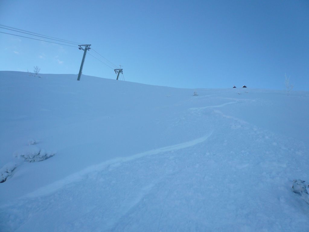 Hier (links) das kleine Kar unterhalb der Bergstation nach einigen Abfahren. Die meisten Abfahrtsspuren sind von mir. Die Tourengeher gehen hier zwar hoch, fahren aber nur selten da runter...