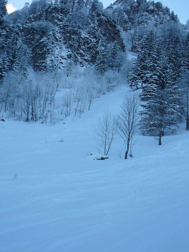 So auf den Geschmack gekommen testete ich dann die schwarze Pistenvariante (unpräpariert): Im oberen Teil vergelichbar Südhang oder Kar, im unteren Teil weniger berauschend mit einigen Steinen. Ich bin die schwarze Variante später noch einige Male gefahren und es ließ sich doch eine ganz gute Spur um die Steine herum finden. Dafür wurde der obere Teil eisiger mit Neuschneehügeln.