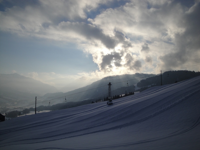Dateikommentar: Die geöffnete rote Piste. Die schwarze Piste entlang des Skilifts ist noch nicht geöffnet, bietet dafür schönes, auch wenn teilweise ein bisschen erdiges Tiefschneegelände.
