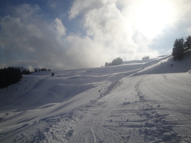 Dateikommentar: Ein kurzes präpariertes Stück an der schwarzen Abfahrt. Links die rote Piste. Auf ihr wechseln sich kurze Steilhänge mit Flachstücken ab. Im Gegensatz zur schwarzen Piste, welche entlang des Lifts verläuft ist sie ziemlich kurvig.