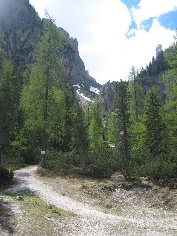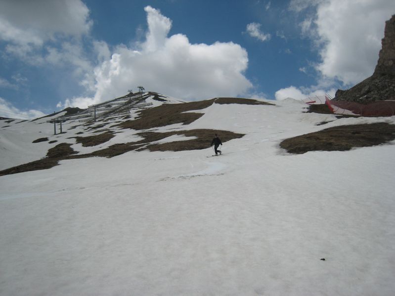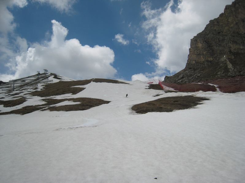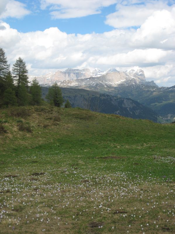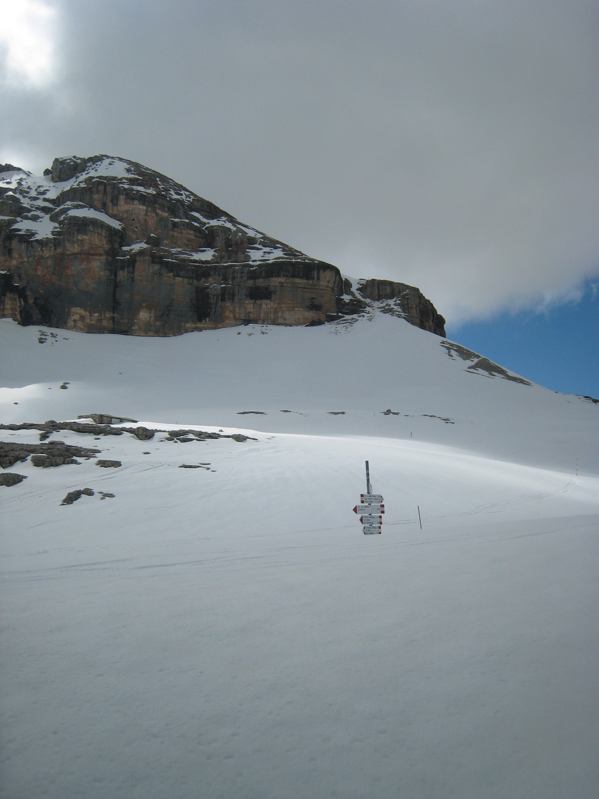 An der Waldgrenze war dann Wechsel des Schuhwerks und Aufsatteln der Ski angesagt, schließlich Abstieg auf dem Wanderweg bis Kolfuschg. Dort fährt um 12:40 der einzige (!!!) Bus bis Arabba, von wo wir zu Fuß bis zum Pordoi-Pass wieder aufsteigen mussten.