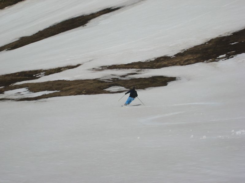 Die Abfahrten waren ein Hochgenuss, es herrschte butterweicher, ideal zu befahrender Firn. Eine zweite Skifahrergruppe, die am Col de Cuc unterwegs war (den hatten wir auch als mögliches Ziel ins Auge gefasst), hatte am dortigen Nordhang eine Oberflächenlawine ausgelöst, so dass wir lieber auf Pistengelände blieben...