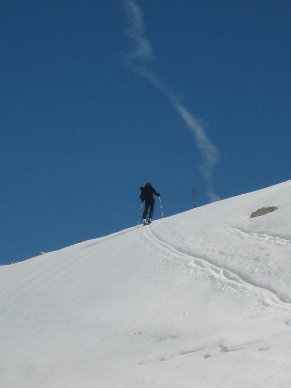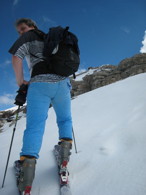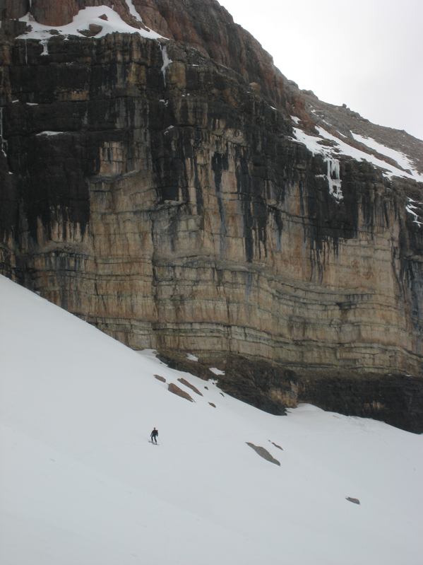 Bei tragfähigem Schnee wie diesmal kann man relativ gefahrlos unterhalb des mächtigen Felsriegels der Boe-Spitze auf ca. 3000m queren. Nach frostfreien Nächten würde ich die etwas mühsamere Variante weit unterhalb des Felsbandes vorziehen... wie klein doch ein Mensch in dieser Welt wirkt!