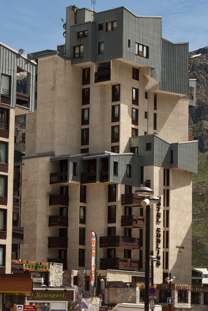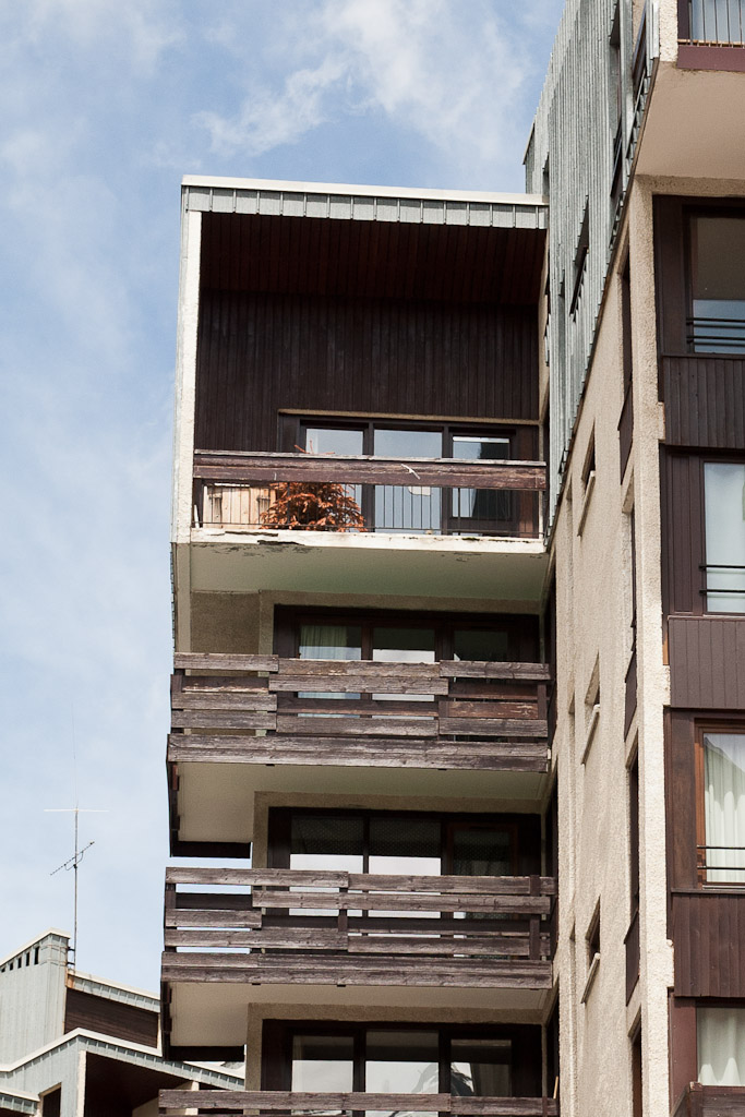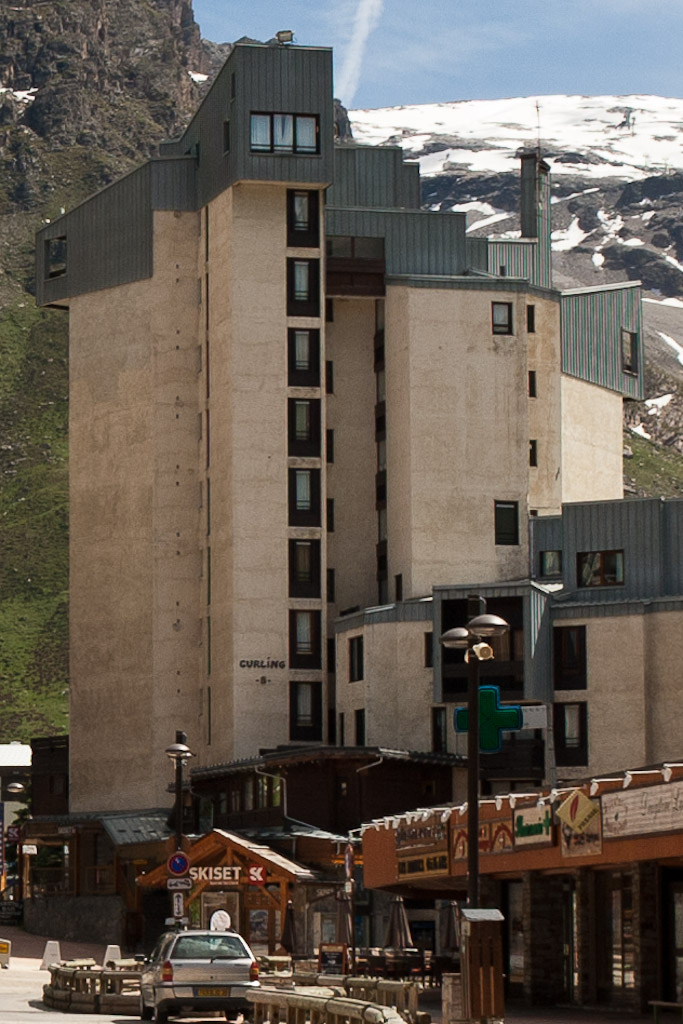 Nachmittags besichtigen wir Val Claret, Pierre Schnebelens Musterstation von 1967, und relativ schnell wird mir klar, woher das berüchtigte Image dieser Hochhaussiedlung rührt. Im Gegensatz zu anderen Skistationen dieser Zeit ist hier scheinbar kaum etwas renoviert worden. Die verschmutzten und heruntergekommenen Fassaden geben selbst im inzwischen wieder strahlenden Sonnenschein dieses nun frühsommerlichen Tages ein äußerst trostloses Bild ab. Wenn diese Gebäude im Inneren nur annähernd so aussehen wie von außen, verwundert mich das grassierende Image von Val Claret keineswegs.