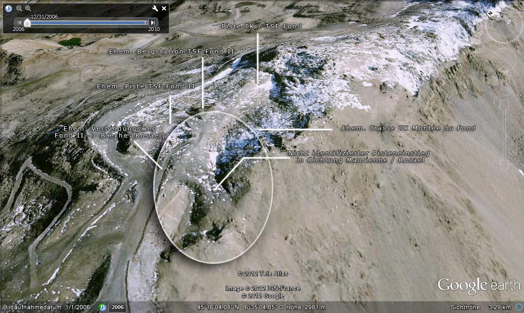 Ebenfalls erneut gut erkennbar, dass die Spuren (TK Caron und ev. Pisten) im Bereich des früheren Gletschers weitestgehend enden. 1986 zum Zeitpunkt des Abrisses des TK Caron könnte der Gletscher schon leicht zurückgegangen sein; das könnte die Trassespuren eine Baustraße in diesem Bereich erklären (irgeneine Form von Baustraße; in den IGN Karten ist sie dort auch angedeutet); allerdings können das auch beim Rückzug des Gletschers entstandene Ablagerungen sein.