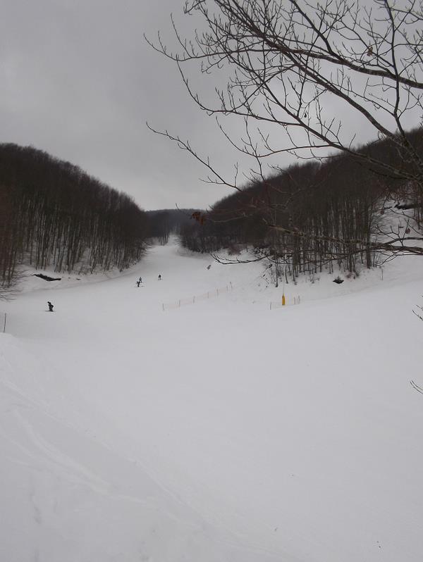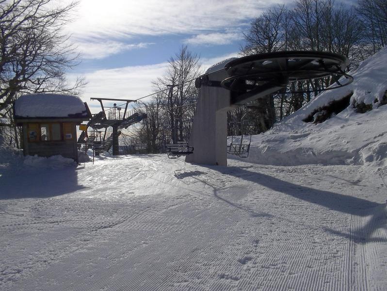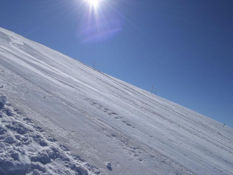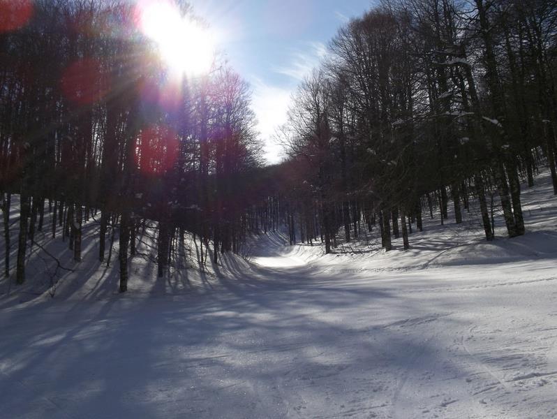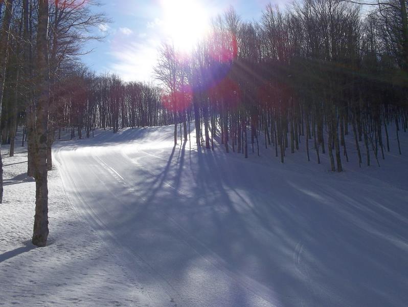 Sellata - Monte Arioso: www: http://www.skisellata.it/ Am nächsten Morgen zeigt sich der Apennin von seiner Schokoladenseite: blitzblau, leichter Wind, milde Temperaturen. Pistenmäßig folgen wohl die schönsten 3h dieses Kurzurlaubs. Ich nehme eine Vormittagskarte, da ich später noch zu einem anderen Gebiet will. Zumindest in den ersten beiden Stunden treffe ich immer die gleichen 15 Skifahrer, erst ab 10 Uhr wird es etwas mehr. Sellata bietet einen Doppelsessel und 5 Schlepplifte sowie 3 Förderbänder, die auch als Verbindungs“lifte“ dienen. Alle erschließen jeweils separate Geländekammern im lichten Wald. Dadurch gewinnt man trotz der bescheidenen Anzahl an Liften den Eindruck eines weitläufigen Skigebietes. Immer wieder gibt’s ne neue Ecke zu sehen! Tja, und die Pisten- und Liftnormierungsbehörde hat’s bisher wohl auch noch nicht in den tiefen Süden geschafft. Das war wirklich eine Zeitreise um 35 Jahre in die Vergangenheit. Keine Pistenmarkierung, kein Fangzaun, keine Polsterung an Bäumen (da hätte man viel zu tun!) und nicht einmal Zäune bei den Zustiegen zu den Schleppliften! Man fährt einfach ran an die Talstation und grapscht sich einen Bügel. Das Liftpersonal – größtenteils wohl jugendliche Wochenend-Jobber aus der Umgebung – erklärt unaufgefordert den Weg zu den anderen Liften, wünscht eine „Buona Giornata“ beim Zustieg oder kommentiert die skifahrerische Leistung („Ch`e figo!“), wenn man nach recht kurzer Zeit wieder am Lift steht. Die "Vorderseite" Sellata ist auch während der Woche in Betrieb: (von http://www.skisellata.it/) ![]() SL A ist ein schöner Graffer-SL, dessen versetzte Parallel-Anlage (Piefaone 1, rechts der roten Abfahrt) schon lange nicht mehr existiert. B ist eine Graffer-DSB, die auch gerne von Fußgängern benutzt wird, die die grandiose Aussicht vom Monte Arioso nutzen wollen. SL C ist eine neue CCM(!)-Anlage, die zur leichteren Verbindung mit dem hinteren Skigebietssektor erbaut wurde. Früher erreichte man diesen über einen ebenen Ziehweg. Die "Rückseite" des Monte Pierfaone bis hin zum Monte Arioso, zu der man auch Straßenzugang von Südwesten her hat, ist nur am Wochenende und in Ferien geöffnet. ![]() Die SLs A, B, C sind flotte Leitner-Anlagen mittelalten Datums. Die Trassierung der Pisten gefällt mir ausgesprochen gut, kurvig, nicht zu breit, und mit ordentlicher Neigung. Die drei Förderbänder "T" benötigt man auch als Verbindungsmöglichkeit. Nebenbei werden sie von der Mini-Skischule am Parkplatz benutzt. Dort gibt es auch ein kleines Restaurant, dessen Cafe-Maschine kaputt war (DESASTRO!!!) und dessen sonstiges Angebot sehr bescheiden war. Ich beginne zunächst mit einigen Runden in Sellata am Piefaone 2 Dateianhang: Dateianhang: Dateianhang: Dateianhang: ... und wechsle dann zu den beiden sehr schönen Abfahrten an der DSB Piefaone 3 Dateianhang: Dateianhang: Dateianhang: Dateianhang: Rote Abfahrt, ost-exponiert und früh schon firnig Dateianhang: Dateianhang: nochmal hinauf... Dateianhang: Dateianhang: Dateianhang: Schwarze Piste, Pulverschnee Dateianhang: Dateianhang: Dateianhang: Bar Dateianhang: