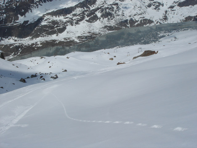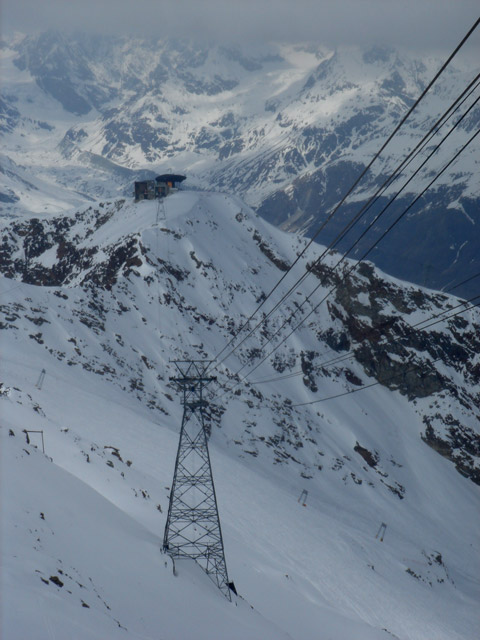 Scheint so, als ob wir voriges Jahr fast zu gleichen Zeit am Stockhorn gewesen wären Die Abfahrt direkt von der Stockhorn-Bergstation bin ich gar nicht gefahren. Die Buckel sind in gefrorenen Zustand nicht wirklich knieverträglich für mich. Aber was mich gewundert hat war, dass sehr wenige die 30 Minuten von der Bergstation weitergestapft sind. Im Sektor unterhalb des "echten" Stockhorngipfels war es zur gleichen Zeit beinahe unverspurt (und bei ziemlich optimalen Schneebedingungen). Auch wenn die Skiliftlösung kommt, um diese alte Bahn ist es wirklich sehr schade. Die Fahrt damit ist sehr eindrucksvoll (einmal haben Seilbahnangestellte vor einer Fahrt noch schnell irgendeine Batterie oder ähnliches ausgetauscht Hier ein Blick von der Cima di Jazzi (erreichbar von der Stockhorn-Bergstation in ca. 2,5h) zurück zum Stockhorn mit Breithorn und Matterhorn im Hintergrund