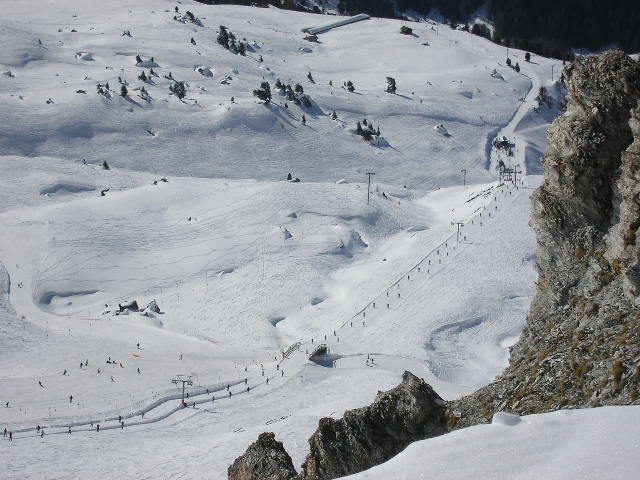 Allein schon die Trümmer von Stützen, die man bei der Fahrt nach Siviez sieht. Aber gut, wenn ich mal einen netten Berg seh, werd ich dort anrufen und sagen, könnt Ihr mir mal für 2 bis 3 Wochen die Bahn dahin stellen, ich wollt dort mal ohne Aufstieg Schifahren. hehe ... Zur 2SB Siviez. Der von der Bergstation nach oben führende Tellerlift erschliesst auch für sich selbst nette Hänge (auch viele Möglichkeiten abseits der Piste). Die Verbindung über Plan du Fou war bei uns (Gerrit et al.) dann schon zu (Schneemangel im unteren Bereich). |