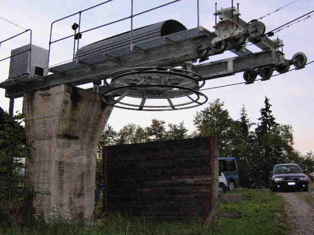 Hier geht schon seit Jahren nichts mehr. Die Teller abmotiert, die Scheiben an der Talstation eingeschlagen rotet dieses Kunstwerk vor sich hin. rechts oben auf dem Grad war die Bergstation des Korbliftes.