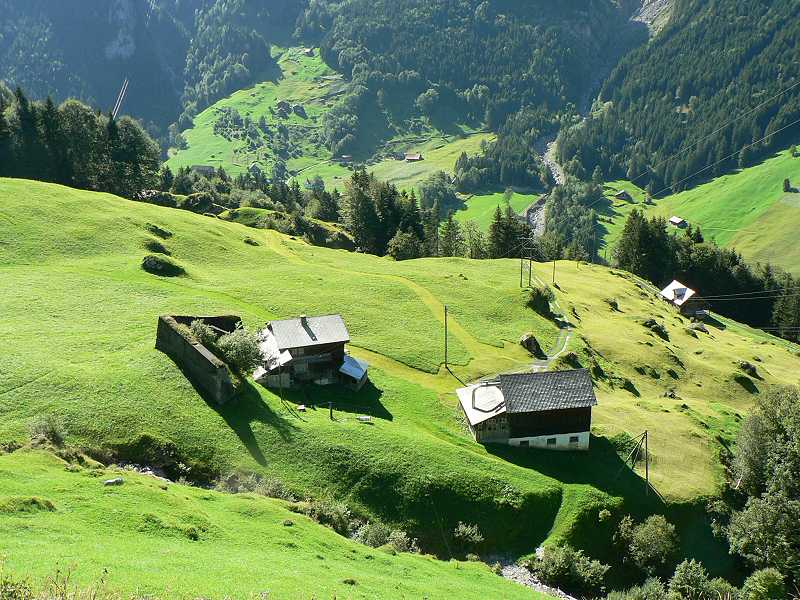 Dateikommentar: Alt Rüri Zurück geblickt in den unteren Teil des Tales. Elektrischen Strom gibt es hier nie, was die Solarkollektoren auf dem Haus rechts beweisen.