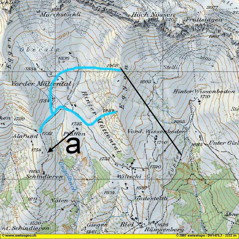 Dateikommentar: Gut zu sehen ehem. Variannte und die neue sind gut 100HM mehr als vorher so kann man besser zu Punkt a Queren ohne viel zu laufen.