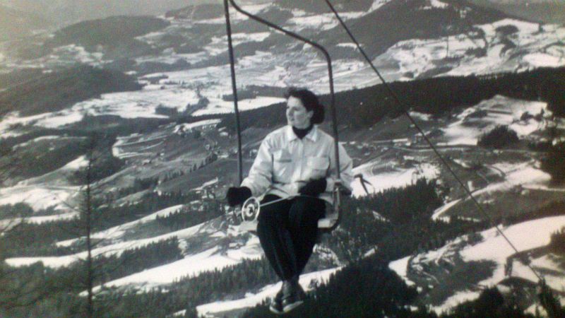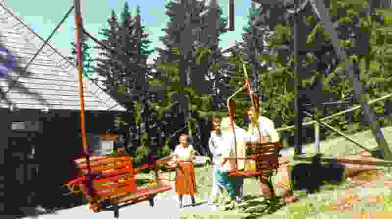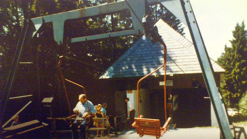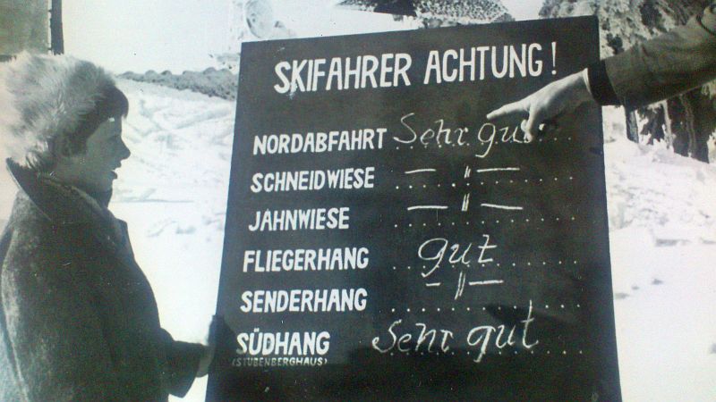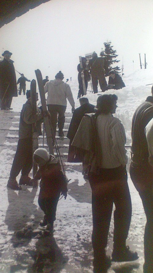Dateikommentar: Die Fahrgäste strömen aus der Bergstation der alten Schöckelseilbahn auf die Piste. Der hier sichtbare Torbogen ist heute ins Bergstationswirtshaus integriert.