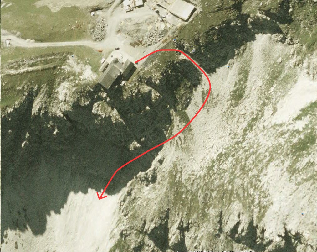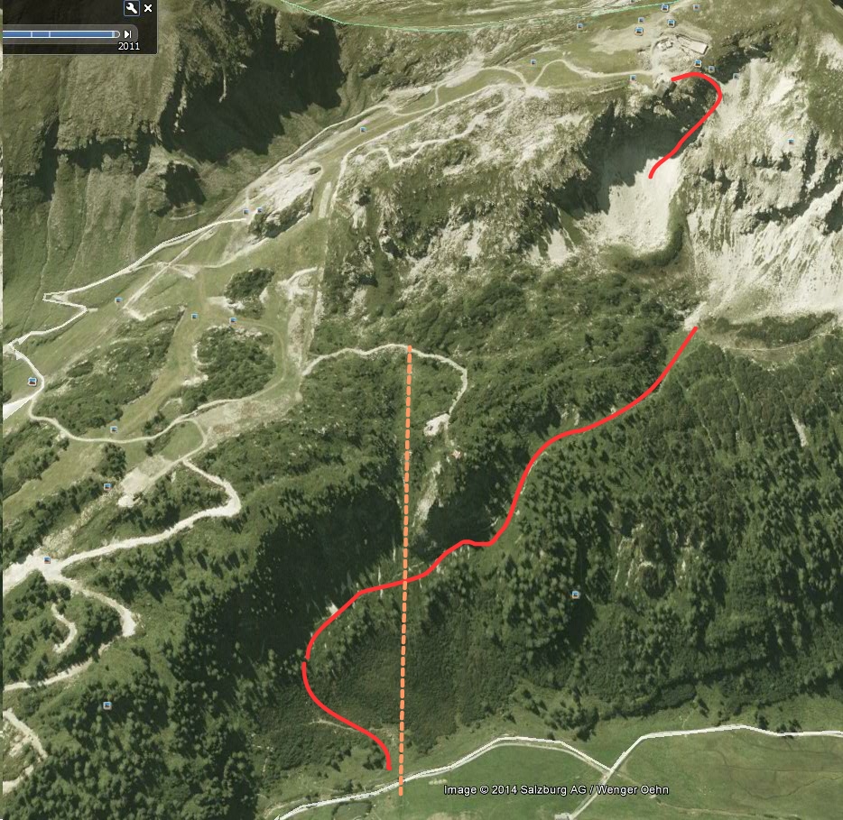 Ich bin fast geneigt, die Wette anzunehmen, weil zumindest der obere Einstieg durch die Felsen dermaßen nach Pistenbau der 60er / 70er Jahre aussieht und ich mir auch sonst nicht erklären könnte, wozu dieser Einstieg gedient haben soll, dass die einzig mir logisch erscheinende Erklärung ist, dass es eine schwarze unpräparierte Piste (à la Gamsleiten) gegeben haben muss. Sicher bin ich mir natürlich keineswegs, aber bisher haben letztlich an den unwahrscheinlichsten Orten plötzlich Pisten existiert (Felspassage in Cervinia, Rückseite vom Sisteron in Isola, Sommerschi auf Schweizerseite in Macugnaga, .... ).