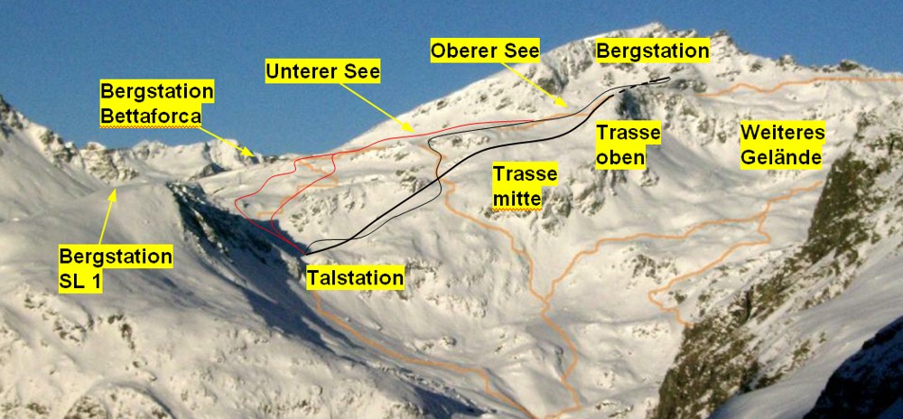 viewtopic.php?p=31055#p31055ob es im oberen Bereich der Bettaforca einen SL oder zwei SLs gegeben hatte. Es gab tatsächlich nur einen SL, der jedoch nach unten wesentlich länger als von Trinc eingezeichnet war und somit das Pistenareal von beiden (hypothetischen) SLs erschloss. Die restliche Rekonstruktion in Trinc's Bild ist völlig korrekt.