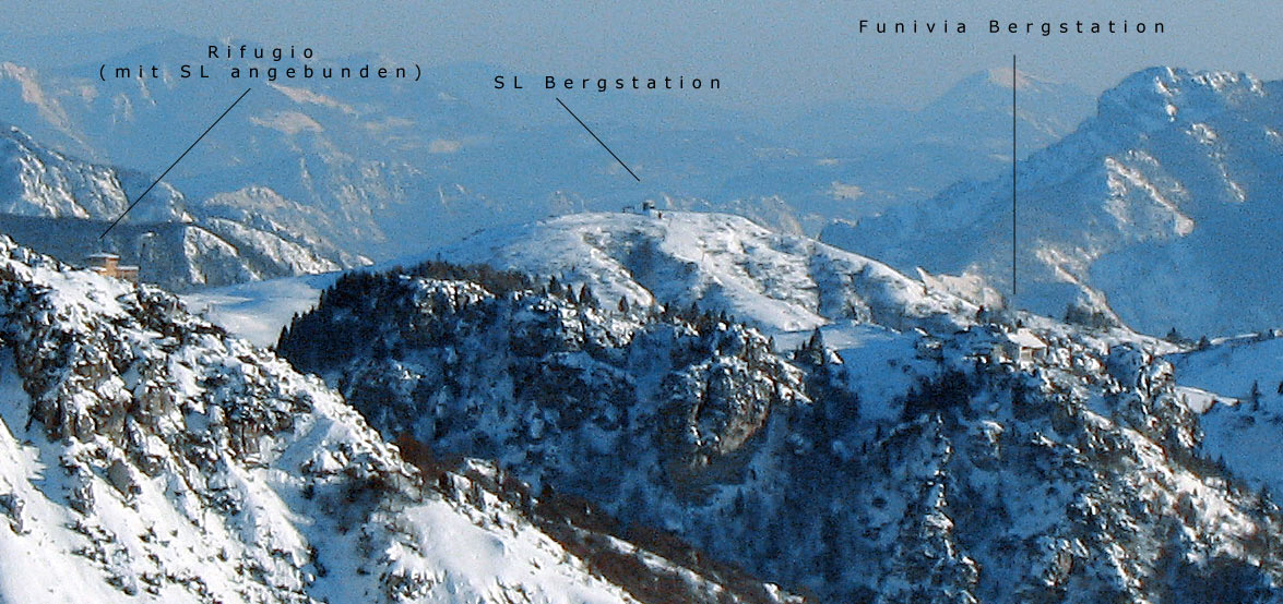 Eine etwas ältere Panoramakarte, auf der beide Schigebiete abgebildet sind: Im Vordergrund das „alte Schigebiet“ Torcola Soliva und im Hintergrund das“ neue Schigebiet“ Torcola Vaga. Wie aus dem Plan ersichtlich, gab es keine Verbindung zwischen den beiden Schigebieten! Auf der Suche nach den Gründen dieser seltsamen Politik sind wir auf folgenden Artikel gestoßen. Aus der Überschrift geht hervor, dass man für Torcola Soliva einen Käufer („nessun acquirente“) sucht, der Betrieb ist derweilen eingestellt. („L’ovovia riaprira“)