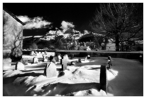 Dateikommentar: Friedhof in Sils-Baselga, Oberengadin auf Kodak HIE, Rotfilter Nr. 25