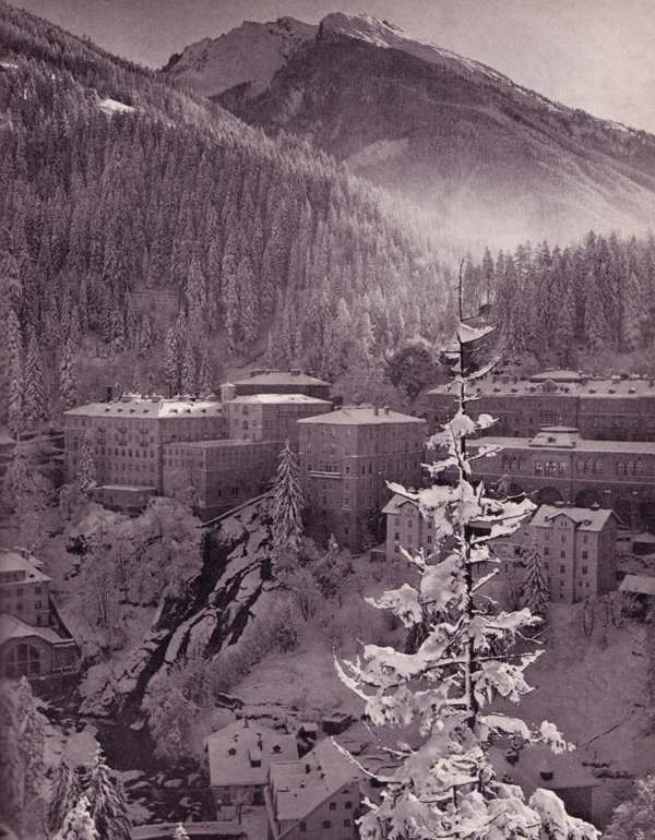 Eine Ansicht der um den Wasserfall gruppierten Großhotels aus der Jahrhundertwende in Badgastein (aus: Hermann Kornacher, "Die schönsten Wintersportplätze", moderne verlags gmbh, München, 1966)