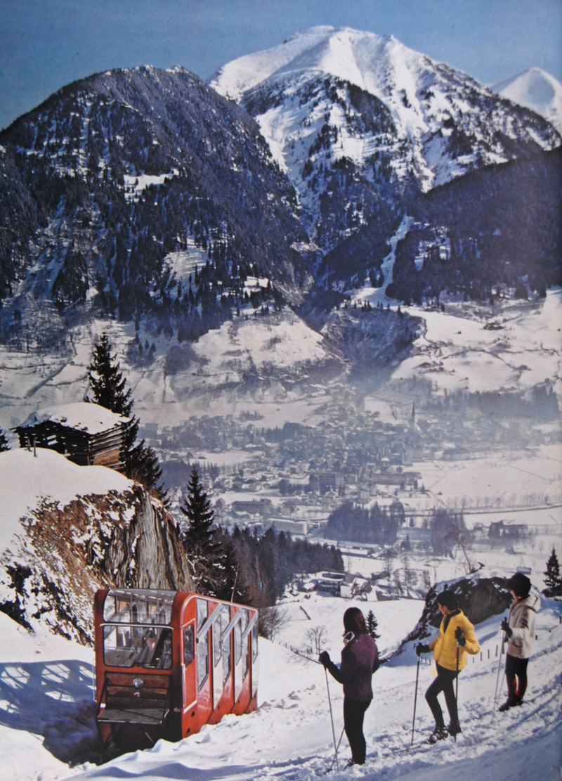 Etwa aus dieser Zeit könnte auch die Aufnahme einer der Plexiglas-Kabinen der Stubnerkogelbahn stammen, sie wurden vom Salzburger Architekten Gerhard Garstenauer entworfen, (auf ihn wird in der Folge noch ausführlich eingegangen,) für das Gondeldesign erhielt er 1973 den Österreichischen Staatspeis für gute Form; im Hintergrund ist der Kreuzkogel zu sehen; (aus: DSV-Skiatlas 1982, Mairs Geographischer Verlag)