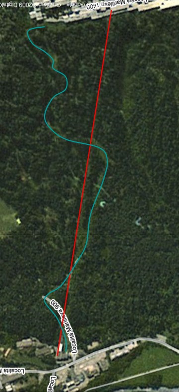 3. Der Einstieg unten (von der neuen 6EUB-Talstation aus über die Straße gelaufen): Ab der Straße zwischen den unteren linkesten Häusern geht ein unbenutzter Weg rein, der aber ziemlich verschüttet ist und auch nicht begangen oder befahren ist. Also auch nicht wirklich einfacher.