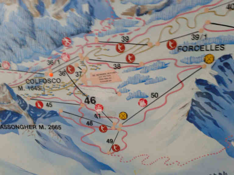 Anfangs Jahr war ich zum Snowboarden Colfosco. Im Skiraum des Hotels hing ein alter Pistenplan an der Wand. Darauf habe ich entdeckt das es mal eine Piste vom Forclles runter zum oberen Teil des Dorfes gab. Die Piste führte am Skilift Belvedere(38) vorbei.